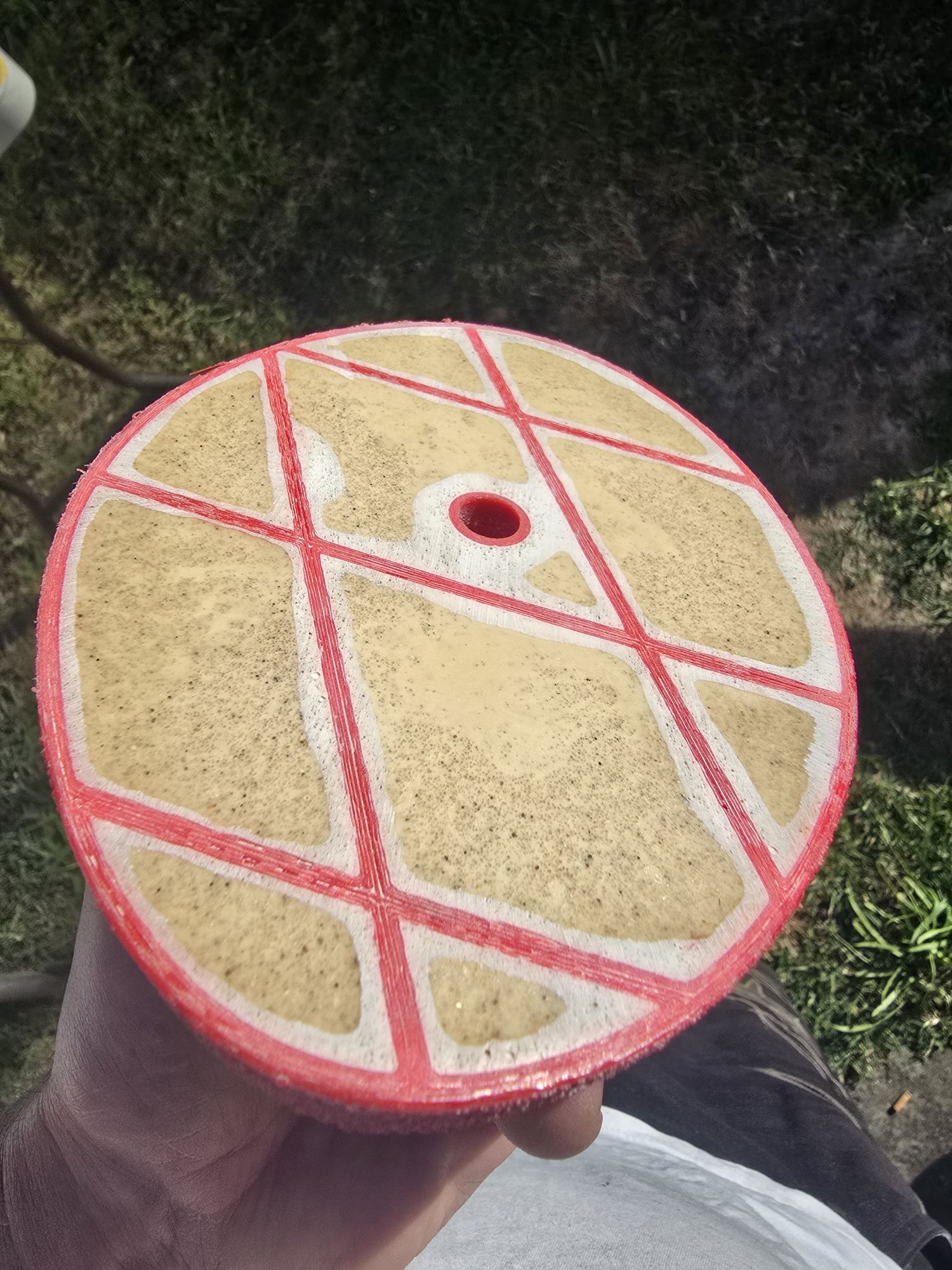 Place some sand in a wide container and place your hold upside-down in the sand, roughly leveling it by eye. We’ll do the pour in stages, the first (few layers are) rough, the final needing a perfect level which we achieve by using the resin as the level against the mold rim (more below).